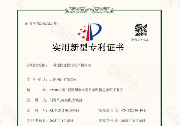 近日,ag凯发k8国际有限公司再次传来佳讯,公司自主研发的“一种能快速排污的平板闸阀”成功获得国家专利授权(专利号:ZL 2025 2 0803965.8,授权公告号:CN 222950449 U)。这一成果不仅进一步丰富了公司在平板闸阀技术领域的专利储备,也体现了企业在产品创新与应用性能提升方面的持续努力。